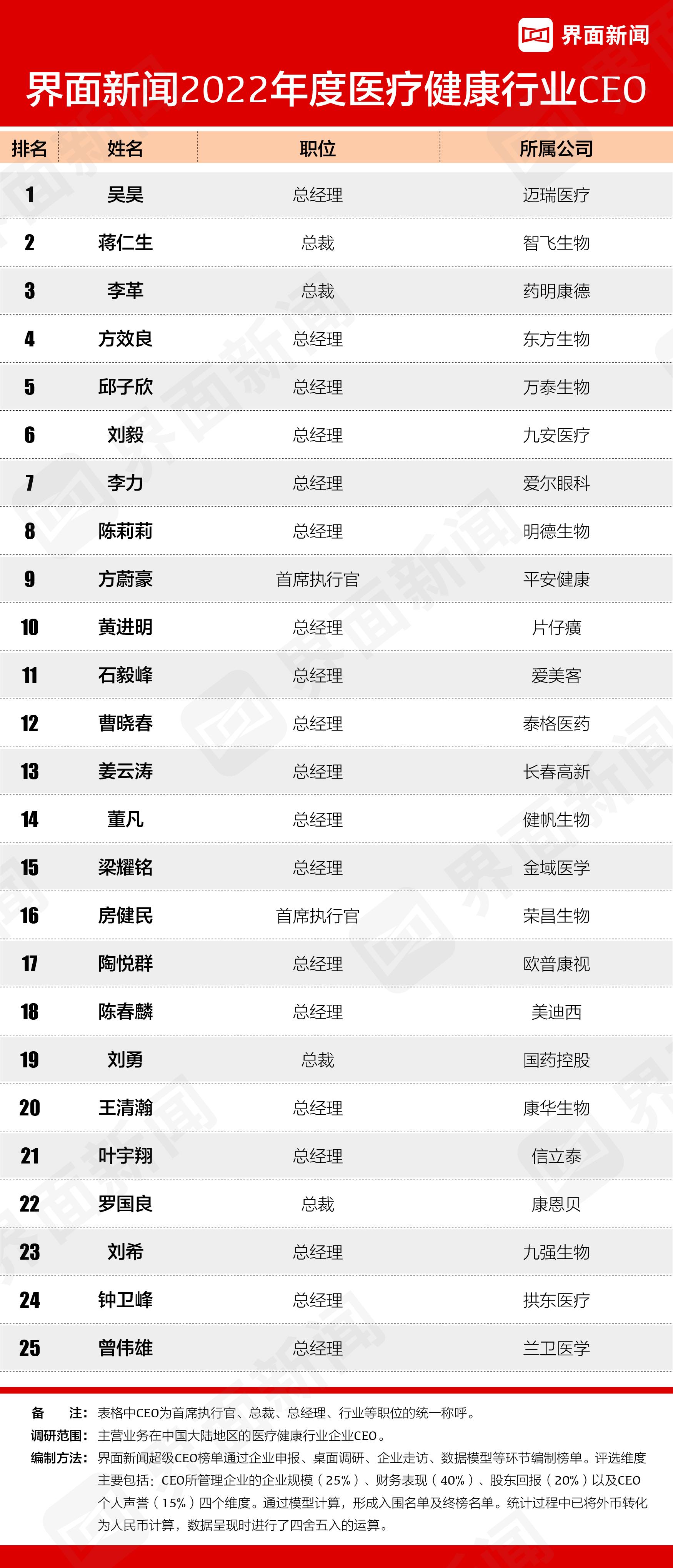 本篇中CEO为首席执行官、总裁、总经理、行业等职位的统一称呼。我们的研究面向中国地区医疗健康行业企业CEO。界面新闻超级CEO榜单通过企业申报、桌面调研、企业走访、数据模型等环节编制榜单。评选维度主要包括:企业规模(25%)、财务表现(40%)、股东回报(20%)、个人声誉(15%)四个维度。通过模型估算,形成入围名单及终榜名单。统计过程中已将外币转化为人民币计算,数据呈现时进行了四舍五入的运算。