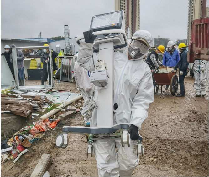 图:雷神山医院建设现场迈瑞工程师运送公司呼吸机