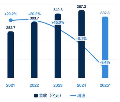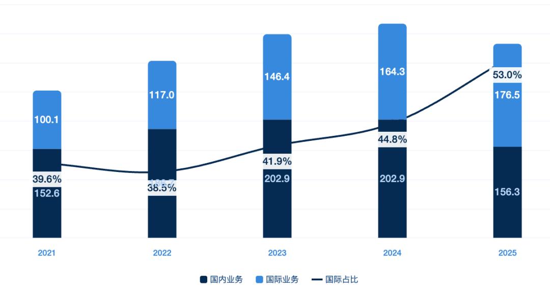 2025年的跌幅,还有个细节掩盖了更尖锐的现实:整体营收下滑9.38%,而国内业务收入156.32亿元,下降22.97%,近四分之一的国内收入,在一年之内蒸发。