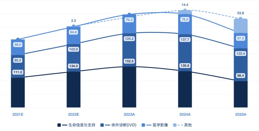 体外诊断营收122.41亿元,同比下降9.41%;生命信息与支持营收98.37亿元,同比下降19.80%;医学影像营收57.17亿元,同比下降18.02%。几乎回到2021年的水平,无一幸免。