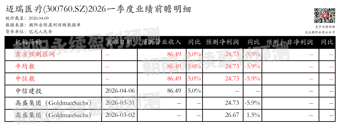迈瑞医疗(300760.SZ)将于2026年4月29日公布2026年一季报。