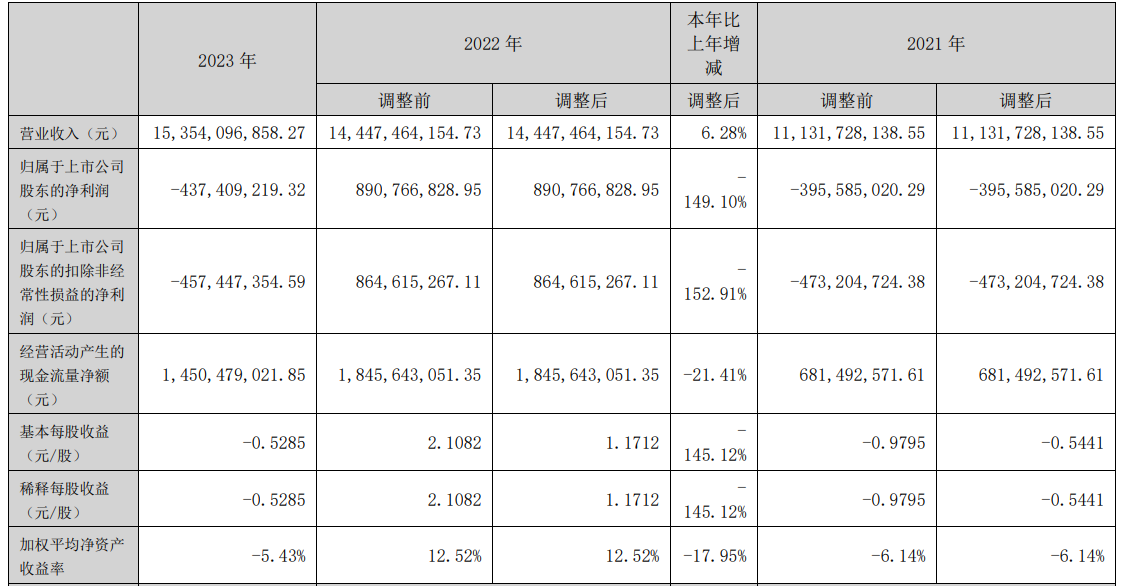 立华股份(300761.SZ)昨日发布2023年年度业绩,公司实现营业收入153.54亿元,同比增长6.28%;归属于上市公司股东的净亏损4.37亿元,上年同期为8.91亿元,同比盈转亏下降149.10%;归属于上市公司股东的扣除非经常性损益的净亏损4.57亿元,上年同期为8.65亿元,同比盈转亏下降152.91%;经营活动产生的现金流量净额14.50亿元,上年同期为18.46亿元,同比下降21.41%。