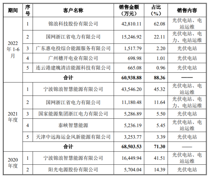 招股书显示,报告期内,晴天科技对锦浪科技的销售金额分别为2475.54万元、16449.94万元、43546.2万元、42810.11万元,占比分别为9.73%、41.51%、45.32%、62.08%,销售内容为光伏电站、电站运维。2019年,锦浪科技是公司的第二大客户;2020年-2021年以及2022年上半年,锦浪科技则稳居公司的第一大客户之位。