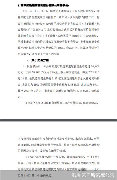 为加快产品布局、丰富公司盈利点,新诺威筹划并购。从披露的方案来看,新诺威拟通过向控股股东发行股份方式收购其持有的石药集团圣雪葡萄糖有限责任公司(以下简称“石药圣雪”)100%股权,标的作价8亿元,其中募集配套资金不超过5亿元。而截至今年三季度末,新诺威手握13.48亿元的货币资金。新诺威的重组方案也被监管盯上,12月3日晚间,深交所对新诺威下发重组问询函,连抛16问。其中募集配套资金的原因及必要性、交易作价较高的原因及合理性是需要新诺威给监管一个合理交代。