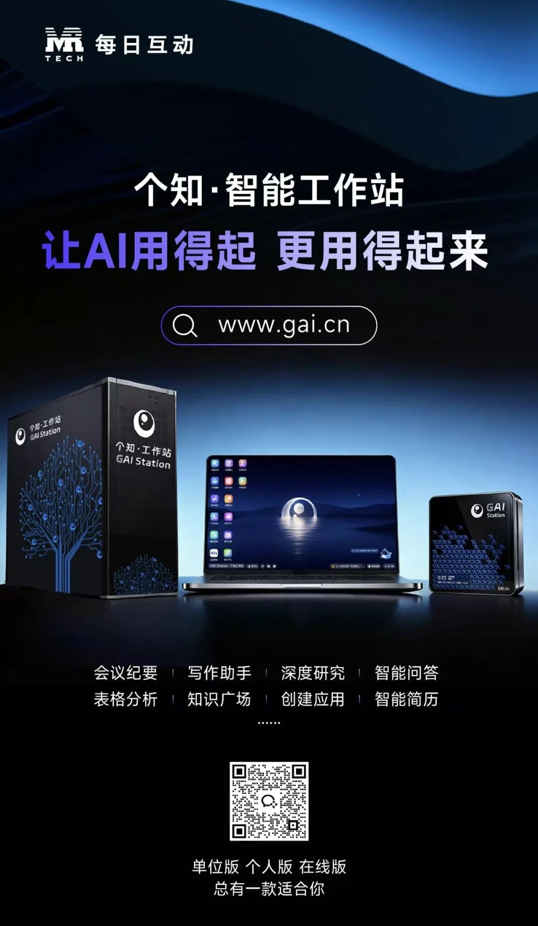 作为从数据智能向人工智能进化的先行者,每日互动正全力推动AI的产业落地。公司于去年推出新一代智能终端——“个知·智能工作站”(GAI Station),以软硬一体的形式将AI能力带入政企日常办公。该产品搭载自研的写作助手、会议纪要、深度研究、表格分析等核心应用,采用“本地小模型+云端大模型”的混合架构,在保障数据安全的同时实现高效智能。目前,个知·智能工作站已广泛应用于政务、医疗、法律、制造等行业,持续助力产业升级。