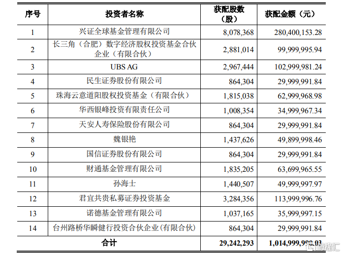格隆汇9月8日丨迪普科技(300768.SZ)披露向特定对象发行股票发行情况报告书,确定此次发行价格为34.71元/股,发行数量约为2924.23万股,募资总额约为10.15亿元;获配对象为14名,锁定期为6个月。