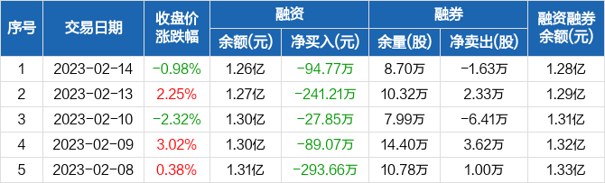 融资方面,当日融资买入288.92万元,融资偿还383.69万元,融资净偿还94.77万元,连续8日净偿还累计1367.81万元。融券方面,融券卖出4000股,融券偿还2.03万股,融券余量8.7万股,融券余额140.72万元。融资融券余额合计1.28亿元。