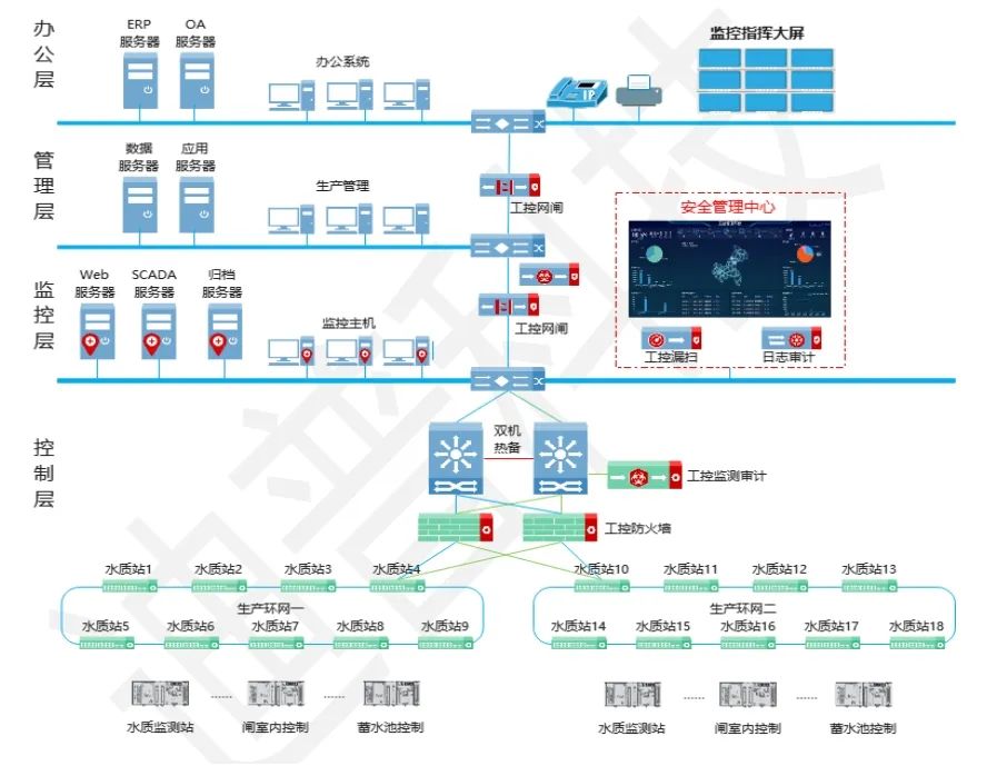 根据等级保护要求,该地的供水项目防护重点要实现“垂直分层、水平分区,边界控制、内部监测,统一管理”。
