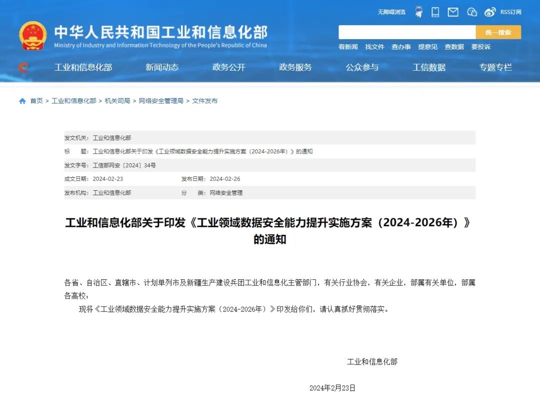 近日,工业和信息化部印发《工业领域数据安全能力提升实施方案(2024—2026年)》(工信部网安〔2024〕34号),(以下简称《实施方案》),《实施方案》是一份具体的行动计划,对如何在未来三年内分步骤、有重点地指导各方扎实推进工业领域数据安全工作进行规划。