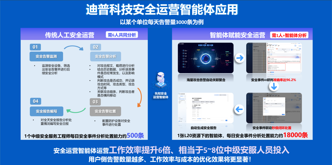 迪普科技 运营商技术部部长孙彪在大会上发表了《人工智能赋能安全运营—— 迪普科技 安全运营智能体》的主题汇报,方案以AI核心技术为引擎,场景化落地为导向,通过构建安全运营智能体,破解当前安全运营中设备碎片化、研判效率低、专业人员短缺等困境,实现安全事件的智能研判、秒级处置与全天候值守,为企业网络安全筑牢防线,推动安全运营从被动响应向主动防御升级,提升数字经济时代安全保障能力。相比传统安全运营模式,AI 赋能的安全运营更强调全链路自动化与智能化闭环。