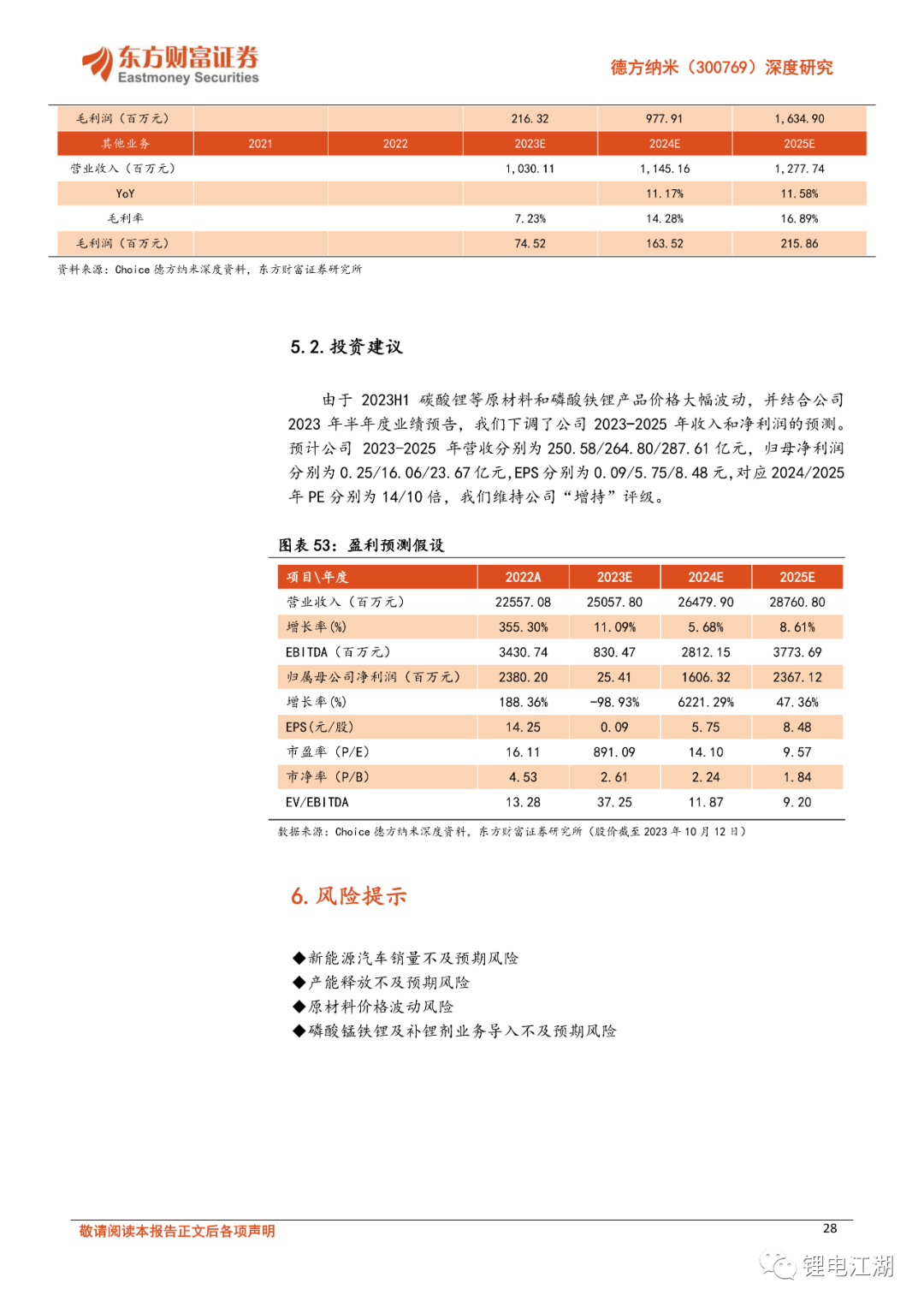 由于2023H1碳酸锂等原材料和磷酸铁锂产品价格大幅波动,并结合公司2023年半年度业绩预告,我们下调了公司2023-2025年收入和净利润的预测。预计公司2023-2025年营收分别为250.58/264.80/287.61亿元,归母净利润分别为0.25/16.06/23.67亿元,EPS分别为0.09/5.75/8.48元,对应2024/2025年PE分别为14/10倍,我们维持公司“增持”评级。
