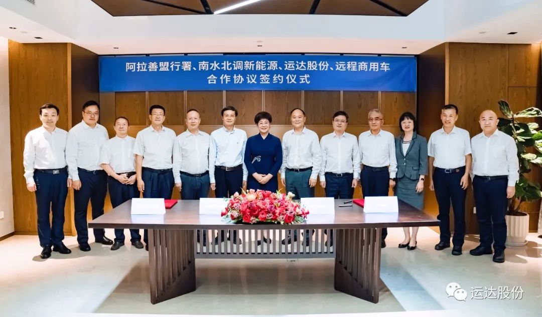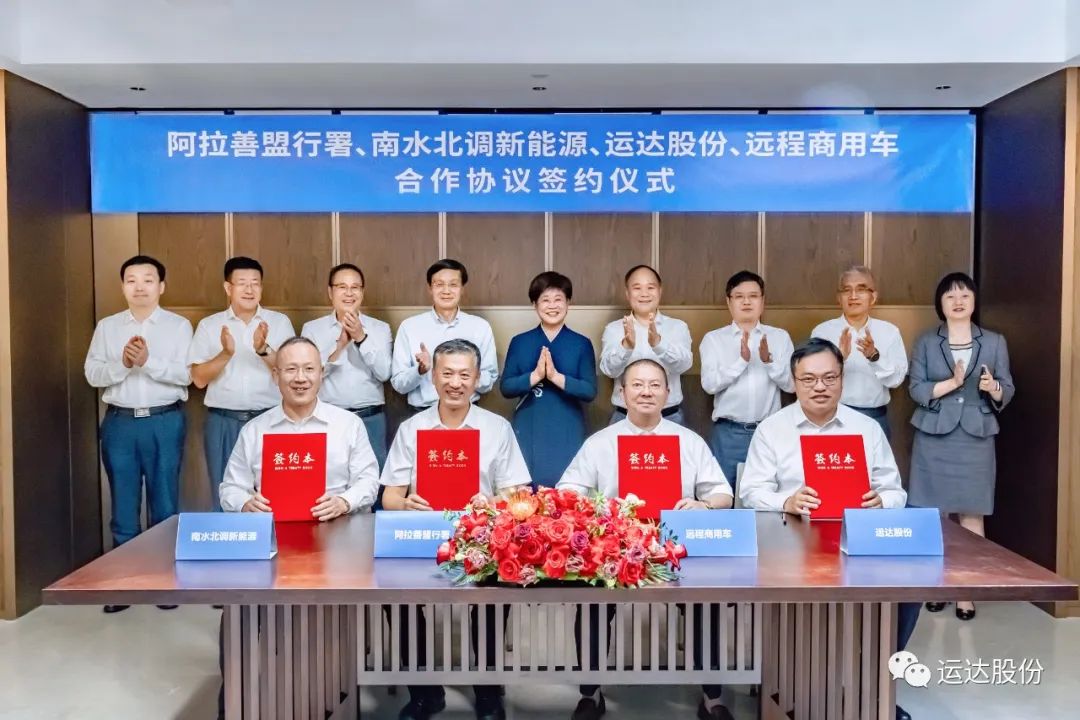 11月3日,运达能源科技集团股份有限公司与内蒙古自治区阿拉善盟行政公署、浙江吉利远程新能源商用车集团有限公司、中国南水北调集团新能源投资有限公司在杭州签订四方战略合作协议。阿拉善盟盟委书记黄雅丽;吉利控股集团董事长李书福;南水北调集团党组成员、副总经理李刚,南水北调新能源公司党委书记、董事长侯社中;浙江省机电集团党委书记、董事长廉俊,运达股份党委书记、董事长高玲出席签约仪式。
