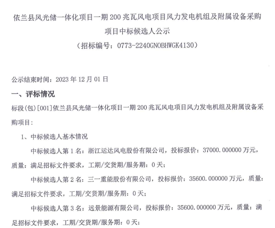 11月28日,依兰县风光储一体化项目一期200兆瓦风电项目风力发电机组及附属设备采购项目中标候选人公示,运达股份预中标,投标报价3.7亿元。