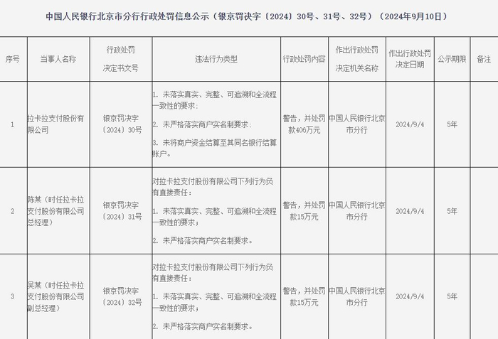 然而,海外扩张野心背后拉卡拉的支付业务合规问题却不容忽视。据不完全统计,该公司2024年共收到7张罚单,累计罚没金额超850万元,其中9月的一张罚单金额高达406万元,直指其存在未严格落实商户实名制要求等问题。
