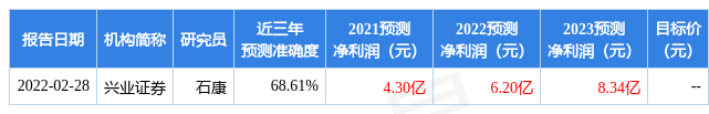 证券之星数据中心根据近三年发布的研报数据计算,兴业证券(601377)石康研究员团队对该股研究较为深入,近三年预测准确度均值为68.61%,其预测2021年度归属净利润为盈利4.3亿,根据现价换算的预测PE为40.34。