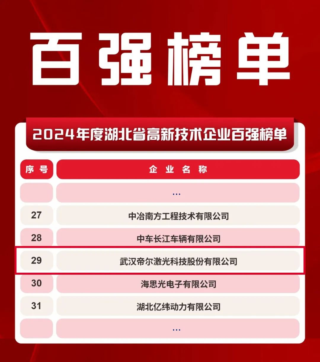 近日,2025年湖北省服务高新技术企业“春晓行动”启动会在武汉召开。会上发布了2024年度湖北省高新技术企业百强榜单,帝尔激光再次入选。