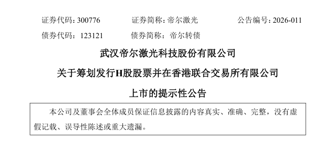 来自湖北武汉东湖新技术开发区的A股上市公司帝尔激光(300776.SZ)发布公告称,为深入推进国际化战略布局,打造多元化资本运作平台,提升国际品牌形象及全球市场综合竞争力,加快海外业务发展,正在筹划发行境外上市外资股(H股)股票并申请在香港联合交易所有限公司主板挂牌上市。截至目前,公司正与相关中介机构就本次发行H股并上市的相关工作进行商讨,相关细节尚未确定。