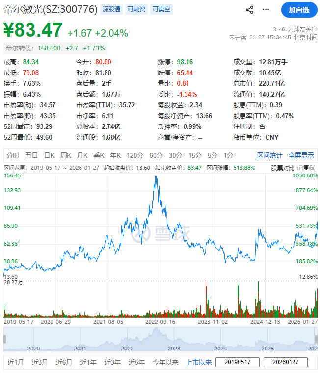 帝尔激光(300776.SZ)于2019年5月17日在深交所上市,截至周二(1月27日)收市,其总市值约228.71亿元人民币。
