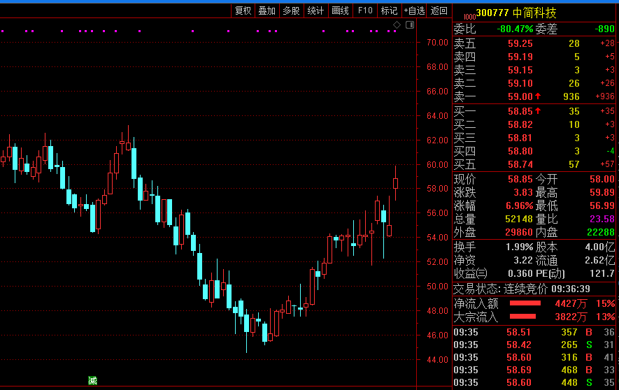 3月15日早盘,中简科技逆市大涨。截至发稿报58.85元,涨6.96%。