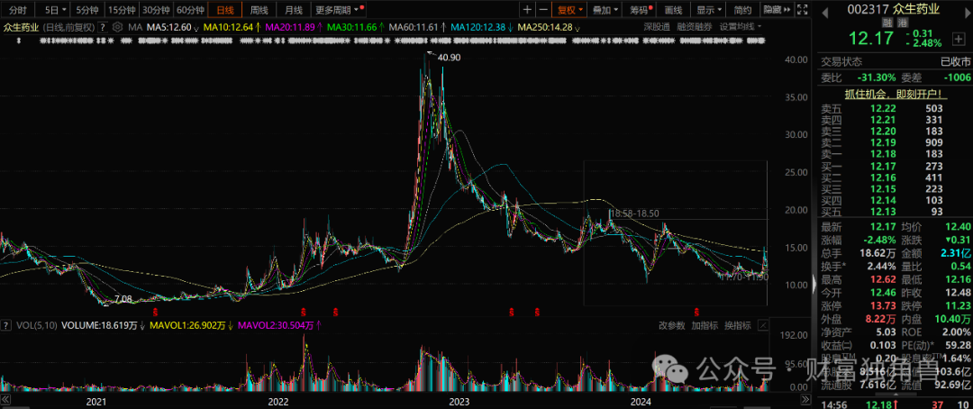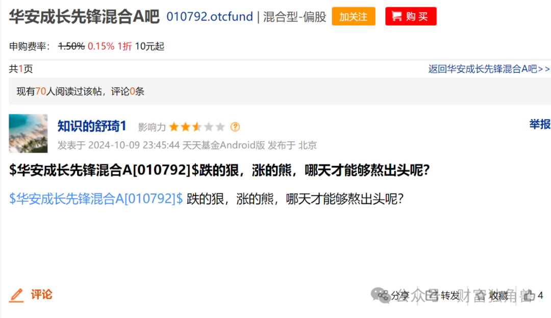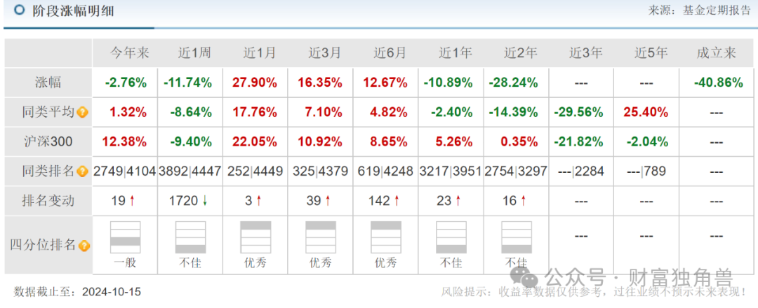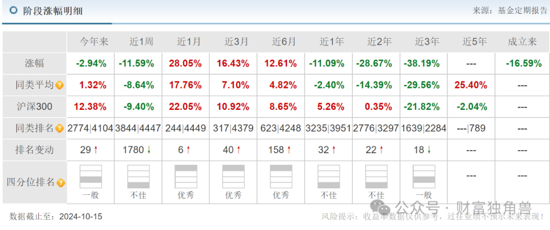 笔者还发现,该基金在2023年4季度持有114.32万股的众生药业,2024年1季度持有114.32万股,2024年2季度持有114.32万股,然而,在该基金持有期间,众生药业股票价格出现下跌,在2023年10月9日-2024年10月16日股票价格下跌了33.46%。笔者还发现,该基金在2024年2季度拿了一部分的医药股,如果医药板块反弹失败,那对基金净值将会造成更大的影响。