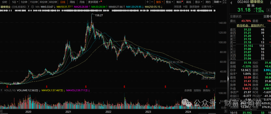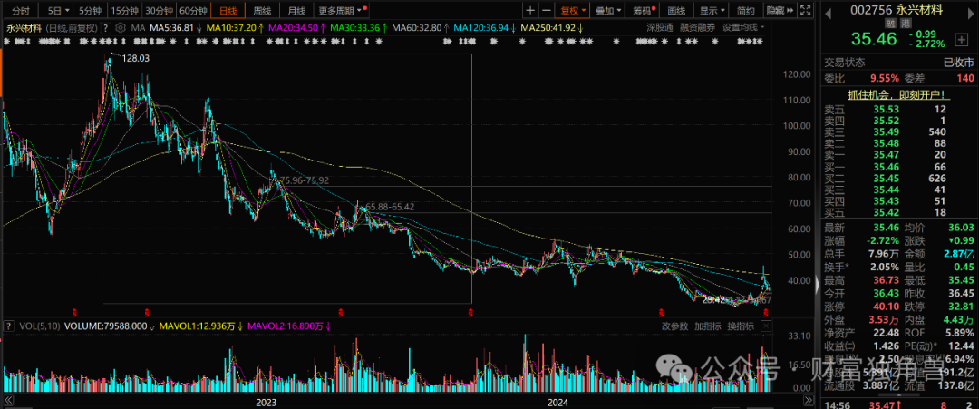 在这期间永兴材料股票价格大幅下跌,这与该基金持有永兴材料时的节奏形成反差,股票价格在2022年7月1日-2023年9月28日股票价格下跌了60%。到了2023年4季度又再度一次性买入92.80万股,2024年1季度持有92.80万股,2024年2季度又将仓至76.97万股,在这期间股票价格波动小了一些,在2023年10月9日-2024年10月16日股票价格下跌了16.59%。