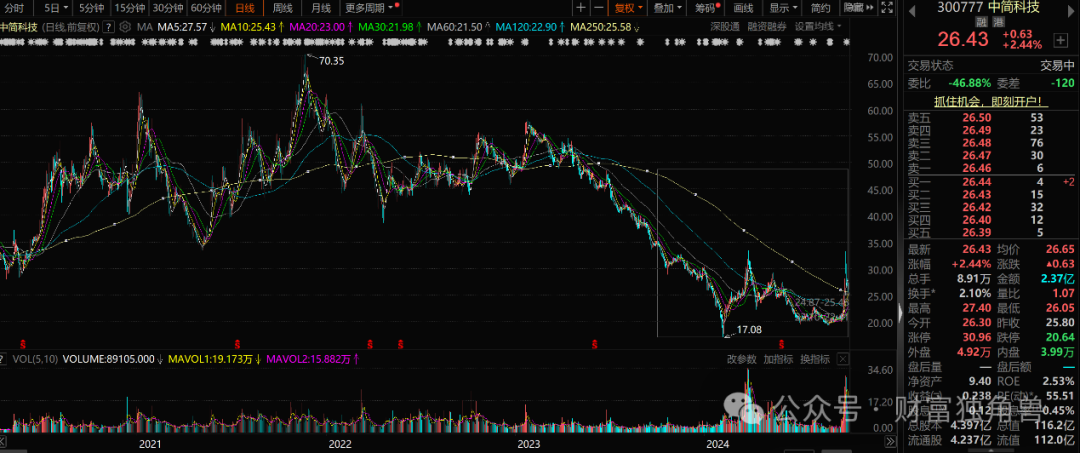 笔者发现,该基金在2023年2季度买进了70.59万股的中简科技,2023年3季度已经没了持仓,在这期间股票价格股票价格下跌了31%。到了2023年4季度又买进了118.47万股,2024年1季度持有118.47万股,2024年2季度继续加仓至131.29万股。在这期间,中简科技在2023年10月9日-2024年10月16日股票价格下跌了25.45%。