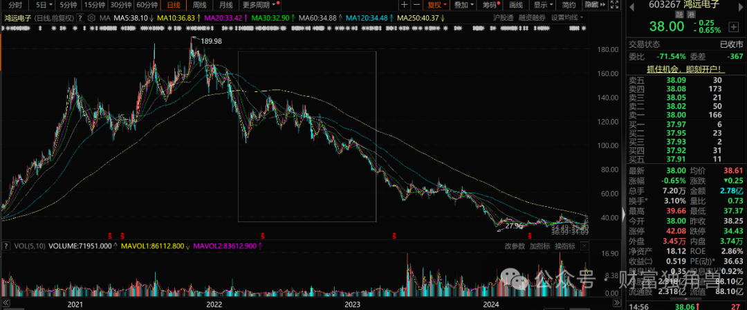 2023年2季度持有34.37万股,2023年3季度持有34.37万股,2023年4季度持有34.37万股。到了2024年1季度又没了持仓份额,在这期间股票价格从2023年4月1日-2024年3月30日股票价格下跌了55.96%。该基金在鸿远电子遭遇2次亏损后,到了2024年2季度又再度买入了21.19万股,这种三顾茅庐的精神令人生疑,在2024年4月1日-2024年10月16日这期间股票价格上涨了12.63%,这次算是抄到底了吗?