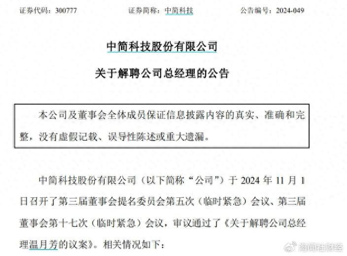 11月1日晚,中简科技公告称,董事会审议通过解聘公司总经理温月芳的议案,由董事长杨永岗暂代公司总经理职务,并担任公司法定代表人。