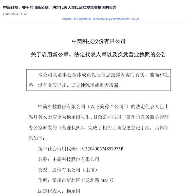 2024年11月12日,中简科技发布《关于启用新公章、法定代表人章以及换发营业执照的公告》称,公司法定代表人已由温月芳变更为杨永岗。目前公司取得了常州市政务服务管理办公室颁发的《营业执照》,完成了相关工商变更登记手续。此外,前期因经营层保管不利遗失中简科技股份有限公司公章及法定代表人章各一枚,已声明作废。