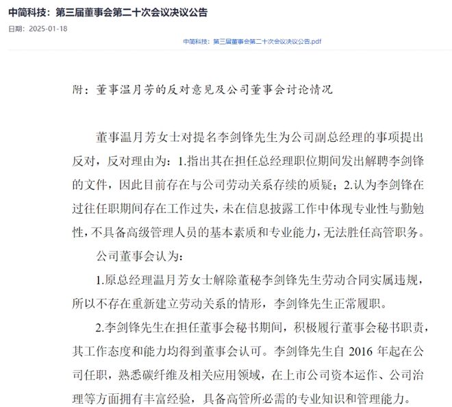 1月17日,中简科技发布公告称,董事会于1月15日召开了第三届董事会第二十次会议。会议上审议了多项议案,其中《关于聘任李剑锋为公司副总经理的议案》获得了6票同意、1票反对,投反对票的系董事温月芳。