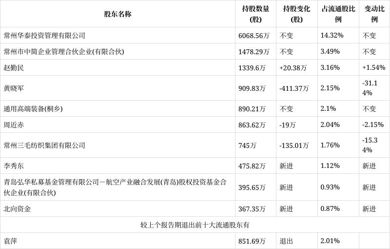 新进的流通股东中,李秀东本期持有475.82万股,占流通股比例1.12%;青岛弘华私募基金管理有限公司-航空产业融合发展(青岛)股权投资基金合伙企业(有限合伙)本期持有395.65万股,占流通股比例0.93%;北向资金本期持有367.35万股,占流通股比例0.87%。