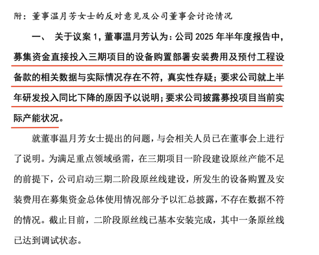 “公司2025年半年度报告中,募集资金直接投入三期项目的设备购置部署安装费用及预付工程设备款的相关数据与实际情况存在不符,真实性存疑;要求公司就上半年研发投入同比下降的原因予以说明;要求公司披露募投项目当前实际产能状况。”董事温月芳表示。