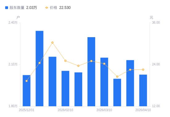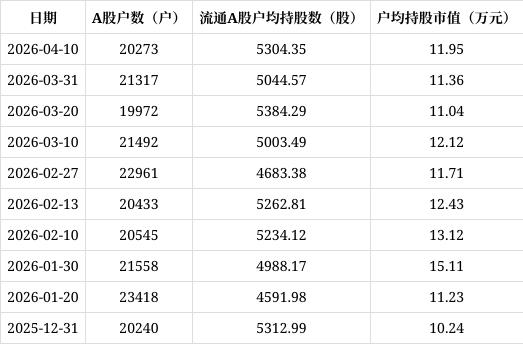 4月13日消息,数据显示,截至2026年4月10日,德恩精工A股股东总户数为2.03万户,较上期(2026年3月31日)减少1044户,降幅4.90%。公司最新A股总股本为1.47亿股,其中流通A股1.08亿股,户均持有流通A股数量为5304.35股,较上期增加259.78股,增幅5.15%;户均持流通A股市值11.95万元,较上期增加5953.74元,增幅5.24%。