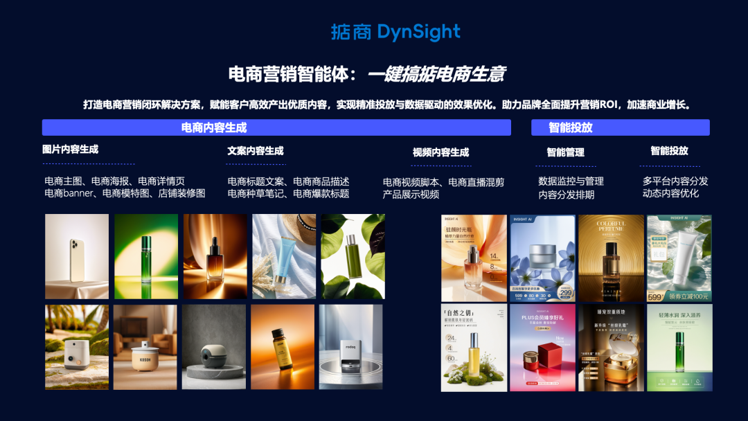 AI电商营销智能体「掂商DynSight」基于因赛集团在营销行业多年的美学积淀、品牌调性及消费者心理解读,产出更具营销洞察力、创意沟通力和美学表现力的AIGC电商内容。近期,团队在调研电商行业需求的基础上,深耕美妆领域,推出针对美妆类商品的AI推荐功能,电商从业人员只需在几分钟内就能完成商品图素材的制作,大大缩短了新品上市的筹备周期,抢占了市场先机。