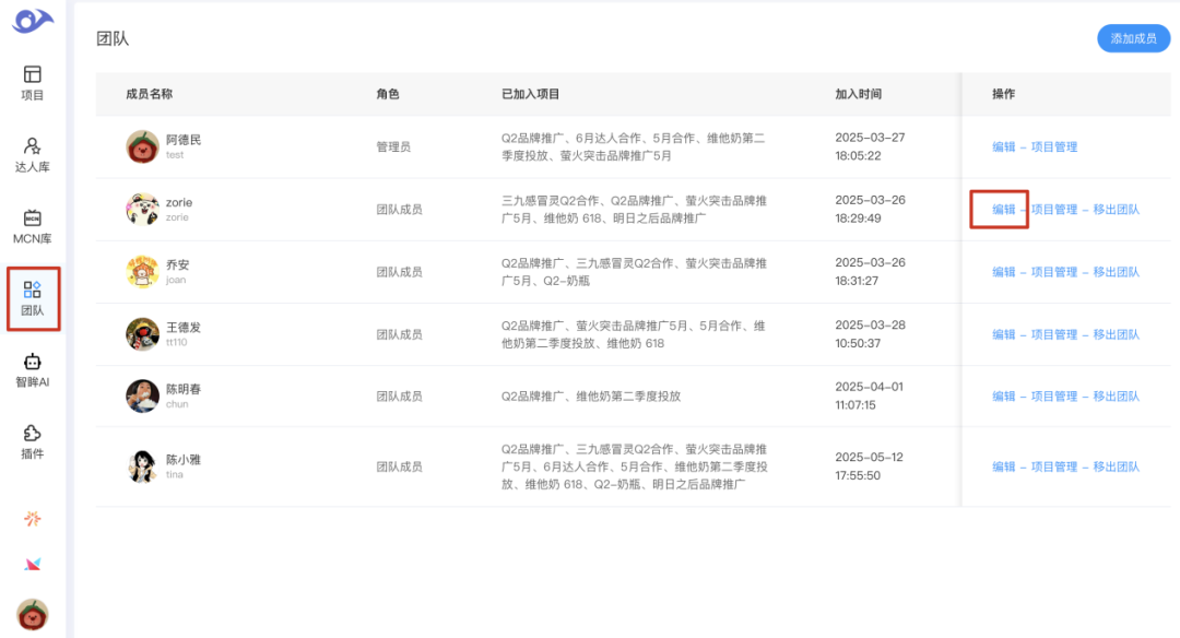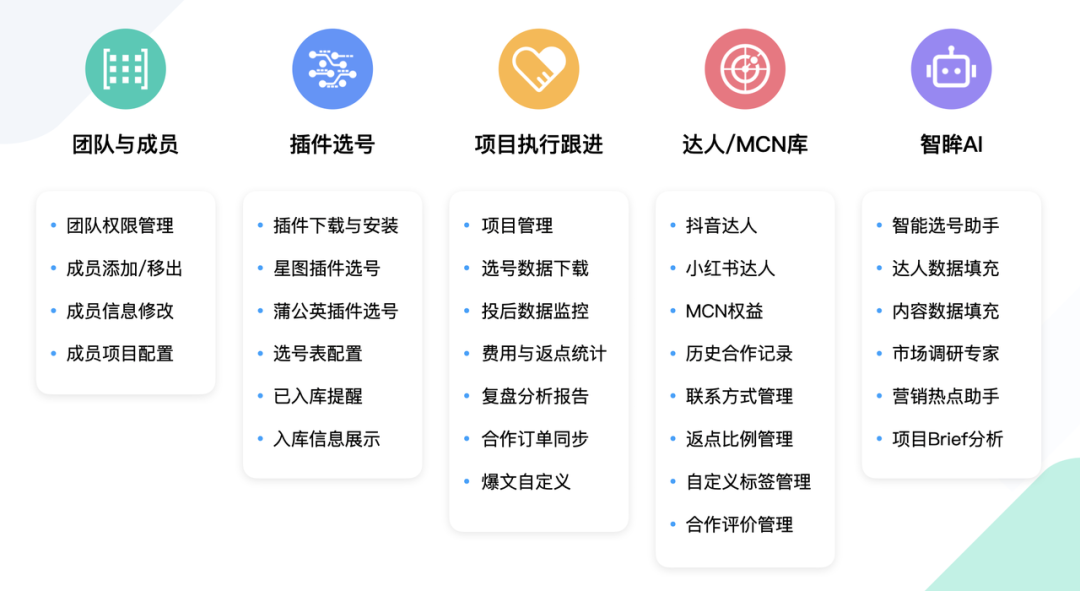 在团队协同层,系统将子公司映射为独立团队,AI自动识别业务关联性并推荐共享达人资源,配合精细权限管控,支持"选号-执行-结算"全流程权责划分,解决"资源割裂"与"权责模糊"难题。