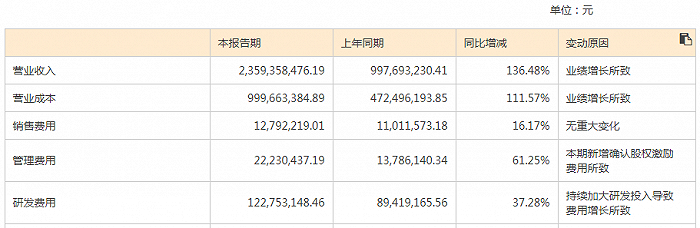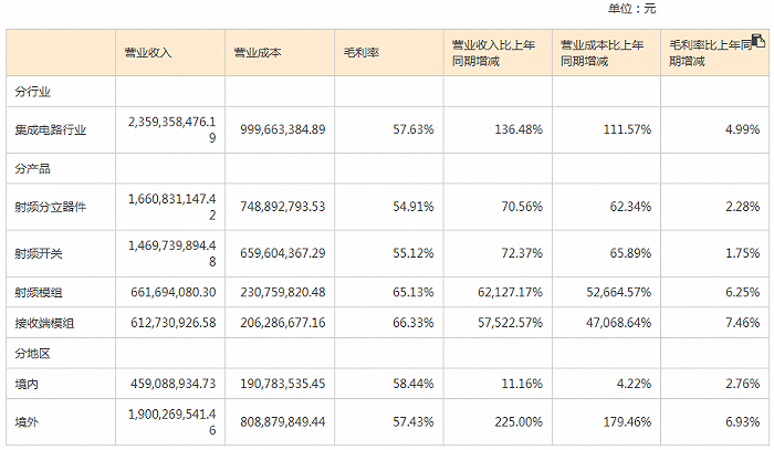 财务数据显示,2021年上半年,该公司的射频模组产品实现营收6.62亿元,销售占比达到 28.06%,毛利率同比增长6.25%至65.13%;同时,其接收端模组实现收入57522.57%至6.13亿元,销售占比约26%。