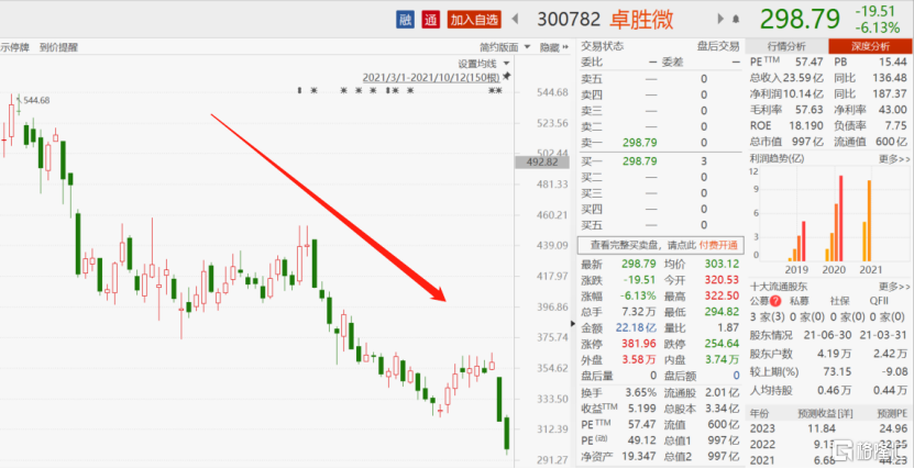 不过,从今年7月份开始,卓胜微股价表现低迷,从最高点544元跌到了目前300元附近,累计跌幅达到42%左右。
