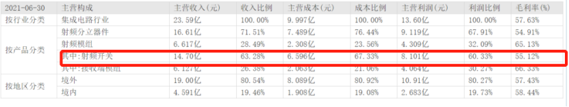 但抛开其他因素,从公司层面出发,让卓胜微成名的是其低噪声放大器与射频开关业务,占比达到63.28%左右,这表明营收结构比较单一。而这项业务未来可能再无法给予其之前那样高的的成长动力。