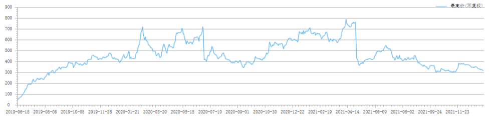 卓胜微于2019年6月18日上市,上市首日开盘价为42.24元/股,至2021年4月12日股价最高上涨至790.3元/股,而后震荡回调。这其中机构抱团“炒作”。2020年1季度机构投资者仅为34家,2020年中报时飙涨逾310家,所持股份占总股本的12%。当年三季度时,大量中小投资机构撤退,大机构涌进,当期逾280家基金撤退,共计4家大型机构大笔买入近2900万股,持股比例达18.3%,至当年年末又有约460家基金进驻。2021年此番景象再度上演,最高时机构投资者近840家,2021年三季末这一数字已降至不到140家。