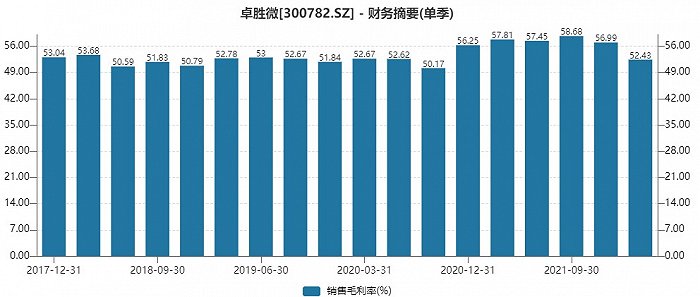 回顾卓胜微2017年以来各季度的毛利率,最低点出现在2020年第三季度,为50.17%。2022年一季度,公司毛利率为52.43%,虽然相比2021年同期的57.81%有所下滑,但仍处于历史平均水平。而在激烈的竞争之下,卓胜微未来的毛利率的中枢是否会降至50%以下,则是投资者值得密切关注的。
