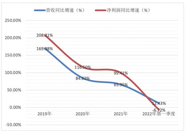 若拉长时间可以看到,2019年以来,该公司收入及利润规模虽大幅增长,但同比增速逐年大幅放缓,且2022年第一季度,公司净利润同比增速已为负数。