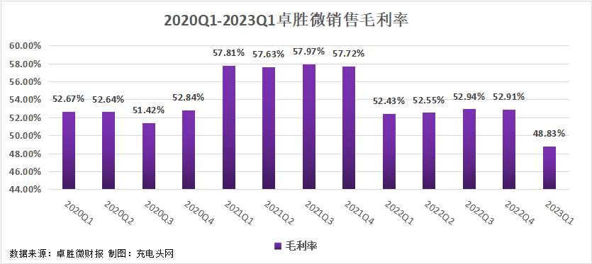 2020Q1-2023Q1,公司销售毛利率在2021年最高,最高值为57.97%,销售毛利率最低是在2023Q1,为48.83%。