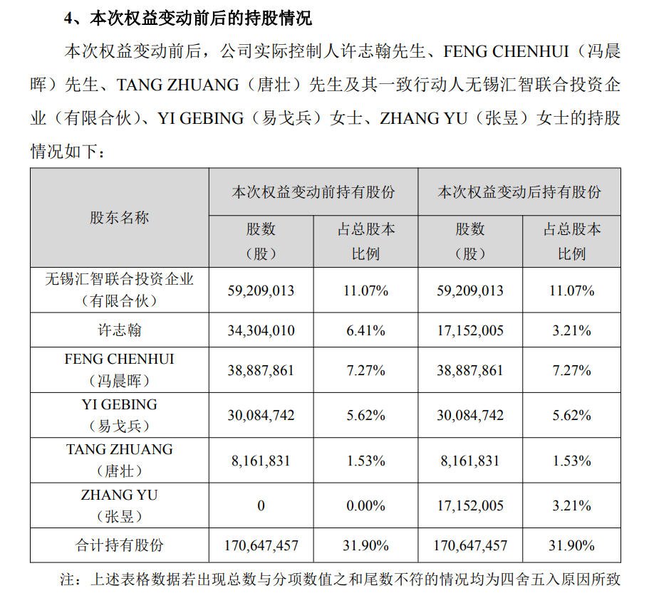 此次权益变动前,许志翰直接持有公司无限售条件流通股份3430.40万股,占公司总股本的6.41%;变动后,许志翰与张昱各自直接持有公司1715.2万股股份,均占公司总股本的3.21%。