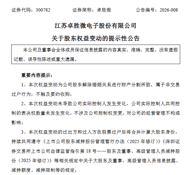值得注意的是,这并非卓胜微实控人首次遭遇“天价离婚案”。2023年6月20日,卓胜微曾公告,公司实控人之一唐壮与易戈兵解除婚姻关系,并进行财产分割。唐壮将其持有的公司3275.74万股股份转让给易戈兵,按照当日收盘价计算,易戈兵分走近34亿元。尽管涉及高额财产分割,但并未对公司的控制权和经营管理产生实质影响。