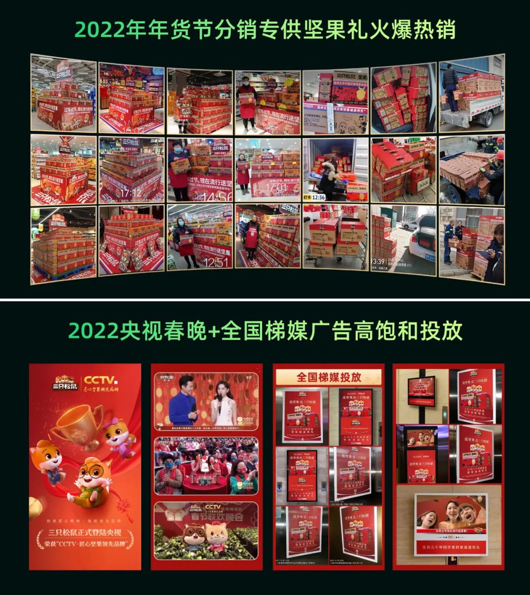2021年10月合作经销商数达到300+;11月完成包含百强商超连锁中的8000+门店、近万家地方小型连锁超市在内的商超进场;年货节执行2平米以上年堆优质门店数3300+,各经销商投入导购人数2000+,三只松鼠在12月通过全国多个城市的梯媒投放、央视广告投放,在全渠道掀起坚果礼热销的浪潮。