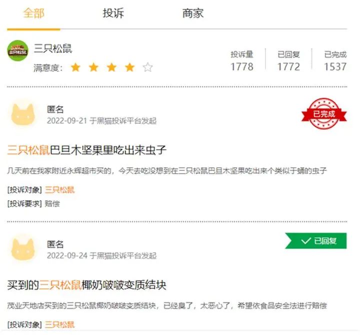 近年来,三只松鼠频频在食品安全问题上翻车,这或许与公司“代工+品牌”的生产模式息息相关。资料显示,三只松鼠旗下的开心果、薯片、每日坚果等畅销产品在多项抽检中,被查出存在不同程度的霉菌超标、致癌物超标等问题。就在2022年5月,三只松鼠的代工厂含羞草因开心果菌落超标被南京市溧水区市监局罚款1万元。与此同时,黑猫投诉平台上也有大量关于三只松鼠食品安全问题的投诉。