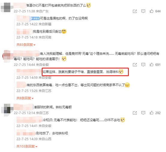 “如果这样,脱氧剂要袋子干啥?直接撒里面,当调味料!”网友对于这样的回答显然难以接受。