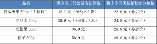 在夏威夷果、碧根果、巴旦木、松子等热销坚果品类中,不少口碑不错的商铺,价格比三只松鼠甚至便宜了将近三分之一。