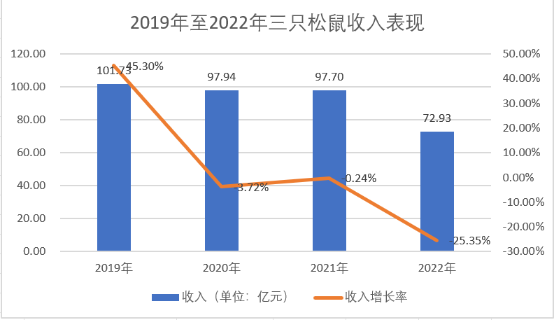 但也是在这一年,零食业显性流量红利逐渐消弭,摆在三只松鼠面前的,是从流量驱动向品牌推动转型时面临的收入下滑问题。该品牌的收入由2019年的101.73亿元缩减至2022年的72.93亿元,增速自2020年起出现负增长,2022年跌至-25.35%。