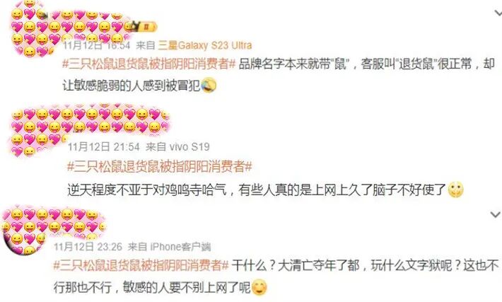 所幸,据笔者观察,事件冲上热搜之后,主流媒体和一些大V的评论区,绝大多数网友,都是站在三只松鼠这一边,认为有些网友是故意找茬、过于敏感……